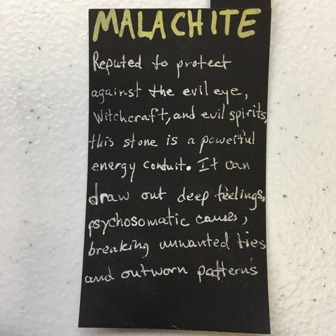 Reputed to protect against the evil eye, witchcraft, and evil spirits, this stone is a powerful cleanser for the emotional body, releasing past life or childhood trauma, but as best used by a qualified healer. Life is lived more intensely under the influence of malachite, a powerful energy conduit.