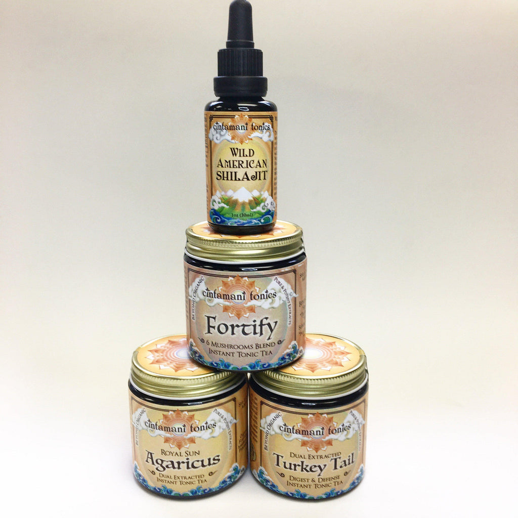 Cintamani Tonics are generally created with 10:1 hot water extraction methods, which is a common term used to describe the specific concentration of an extract. This essentially means that 10 lbs of herb matter has gone through an extraction process, and the final product is 1 lb of completely water soluble herbal concentrate. The final product is therefore 10 times more potent than the simple powdered herb.