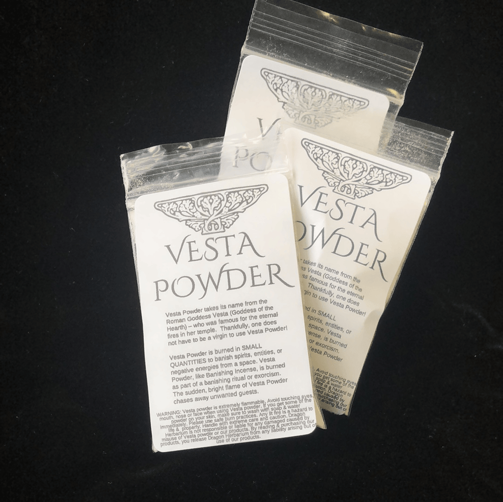 WARNING: Vesta powder is extremely flammable. Avoid touching your eyes, mouth, nose or face when using Vesta powder. If you get some of the powder on your skin, make sure to wash with soap and water immediately. Please use safe burn practices. Any lit fire is a hazard to life and property. Handle with extreme care and caution. Dragon Herbarium is not responsible or liable for any damaged caused by misuse of Vesta powder or our products. By reading and purchasing our products, you release Dragon Herbarium from any liability arising out of use of our products.