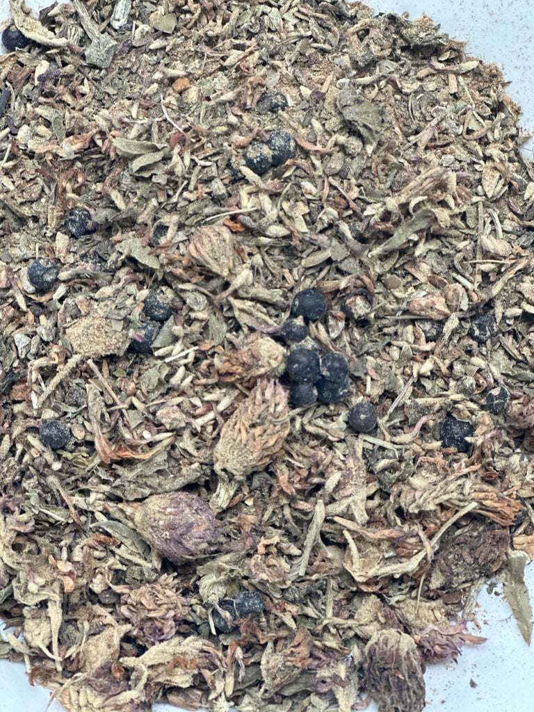 Ingredients: Red Clover, Burdock Root, Echinacea, Milk Thistle, Dandelion Leaf & Root, Uva Ursi, Sarsaparilla, Juniper Berries.