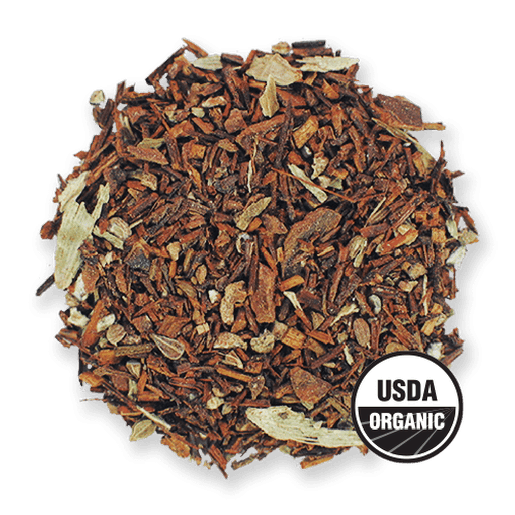 A non-caffeinated, herbal version of the classic Indian spice tea, this Red Chai blends hearty red South African rooibos with house-roasted whole spices for a warm, decadent cup of tea for anytime of day. Delicious simmered in milk or steeped in water. Also try with a touch of sweetener.