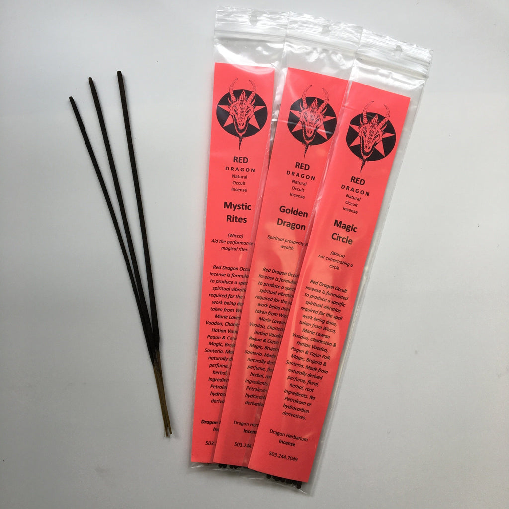 Red Dragon Occult Incenses are formulated according to the traditional formulations for the stated purpose. Their odors, formulated to produce a specific spiritual vibration required for the spell work being done, are taken from